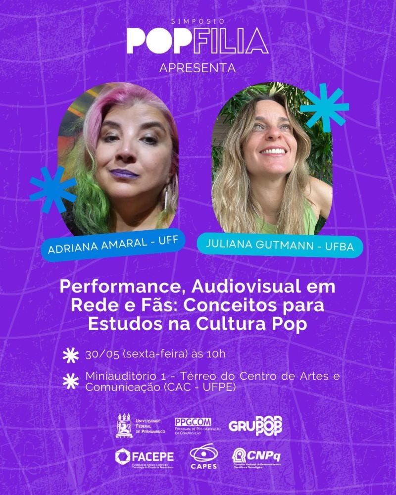 Aliás, estarei falando sobre esse novo projeto "Zona Fandomizada Temporária. A fandomização das plataformas digitais e dos fenômenos da cultura pop", no evento de Esquenta Popfilia, na conferência intitulada "Performance, Audiovisual em Rede e Fãs: Conceitos para Estudos na Cultura Pop" conjuntamente com a colega Juliana Gutmann da UFBA na UFPE , sexta dia 30/05 às 10h.