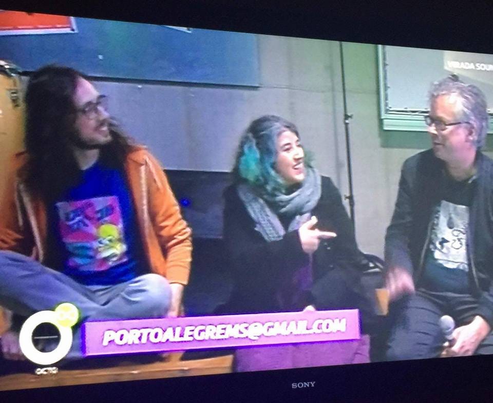 Participação da equipe do projeto POA Music Scenes na TV, divulgando os resultados da pesquisa no canal Octo em 2016. Crédito: Juliana Bortholuzzi